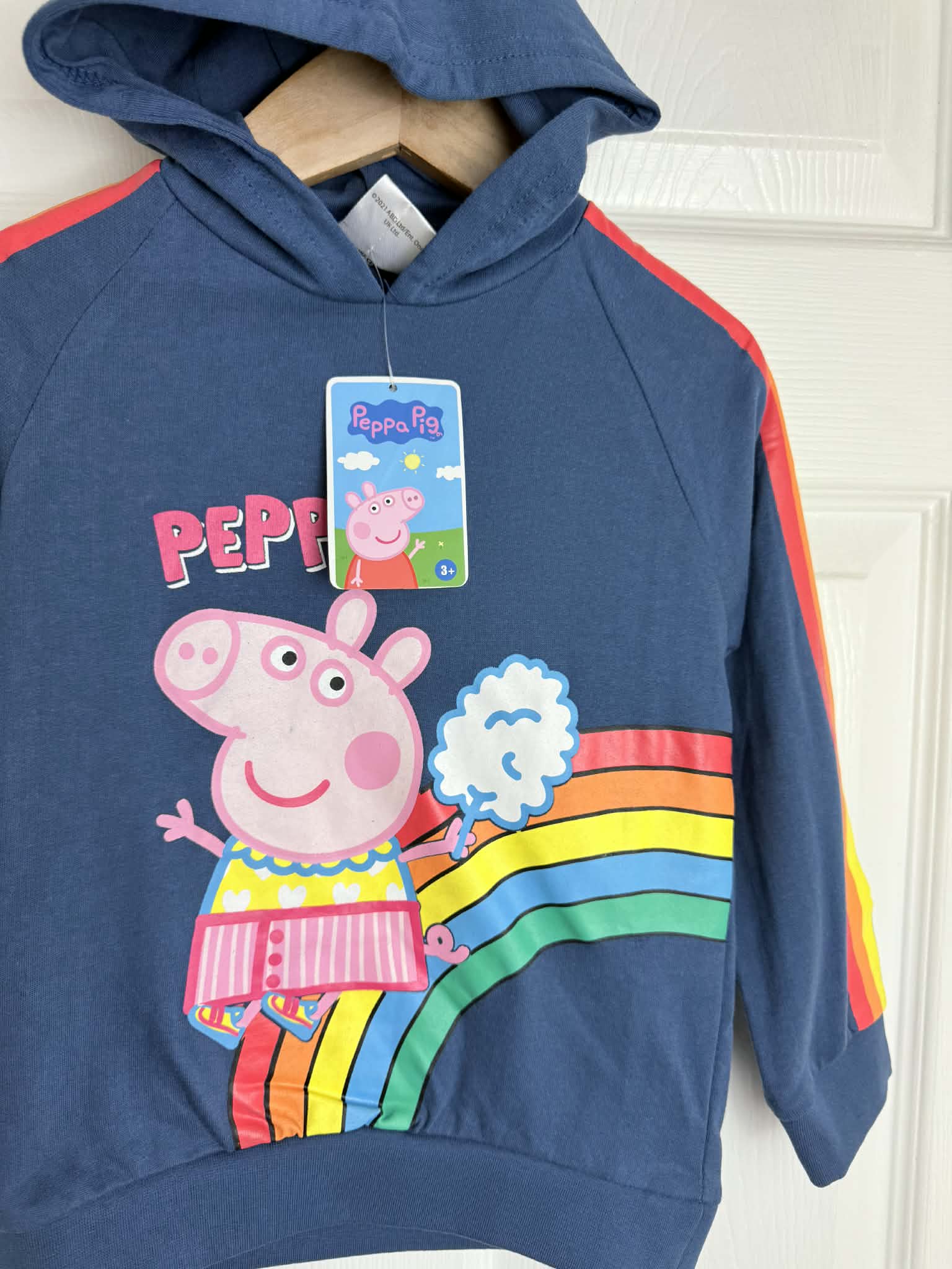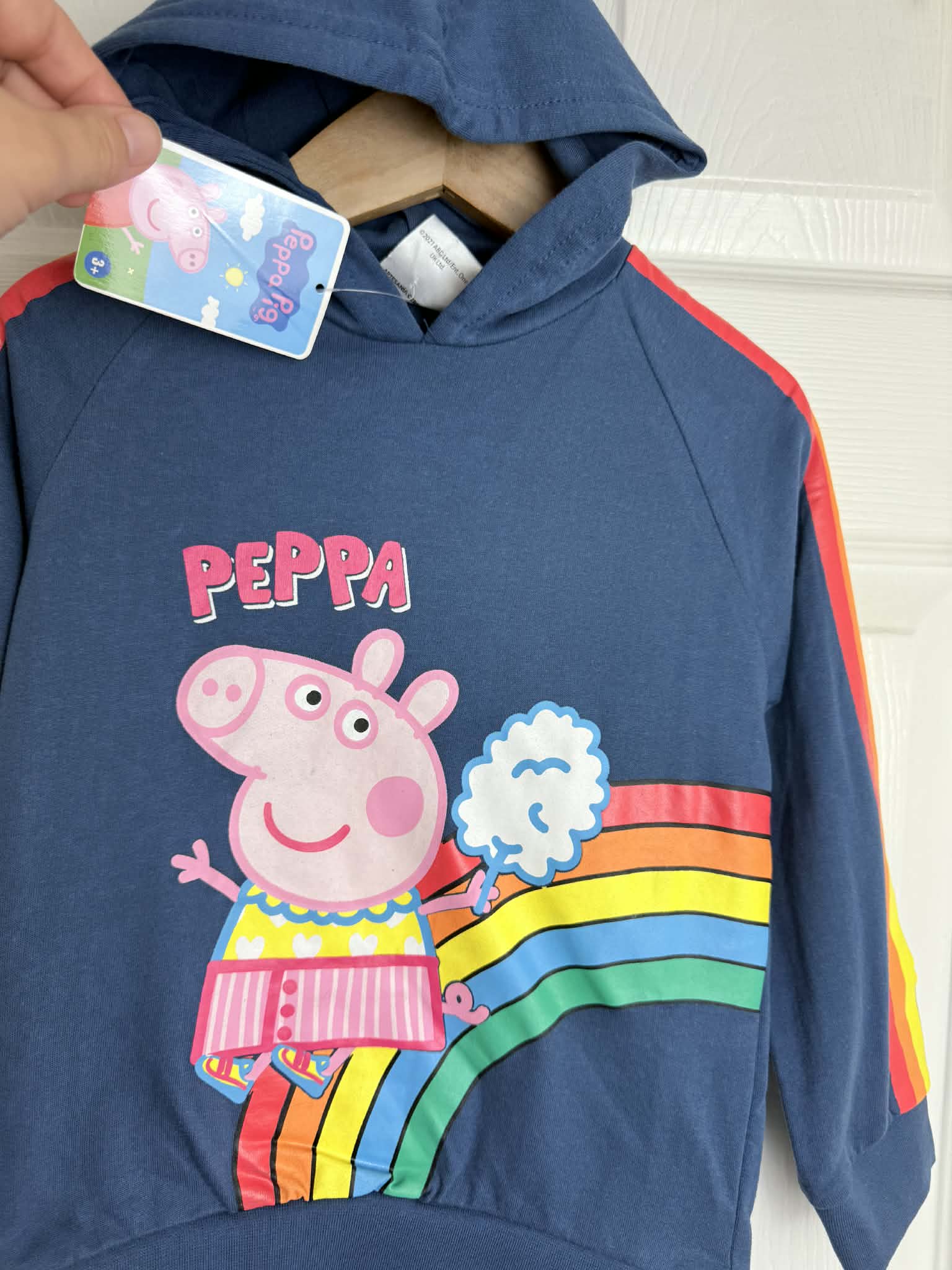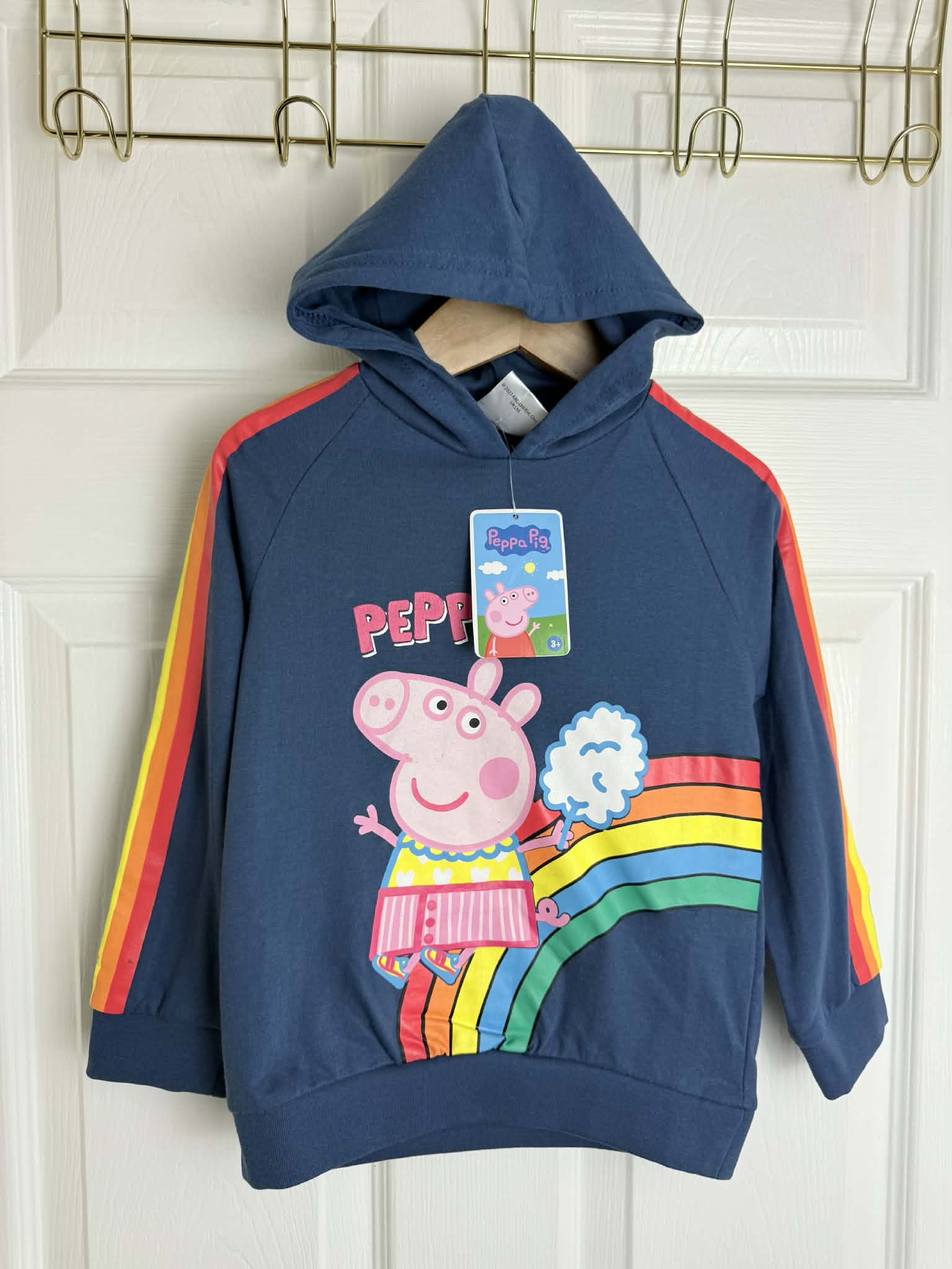 Brand new Peppa Pig hoodie top, perfect for little fans of the much-loved character. This navy blue hoodie features a colourful rainbow design with Peppa Pig on the front, plus bright rainbow stripes running down the sleeves for a fun, playful look.